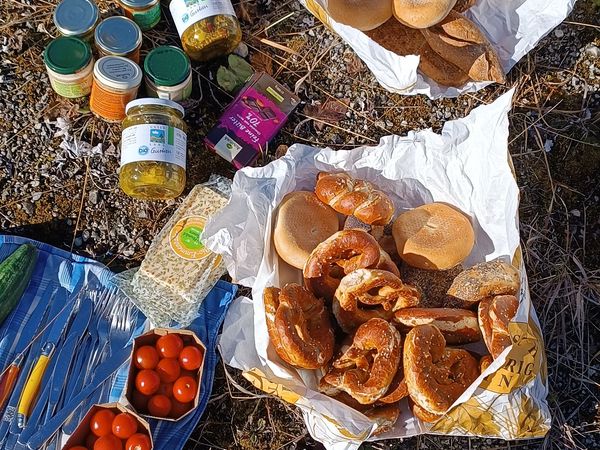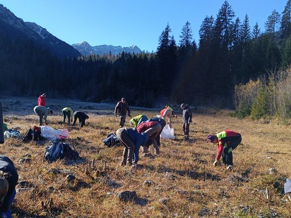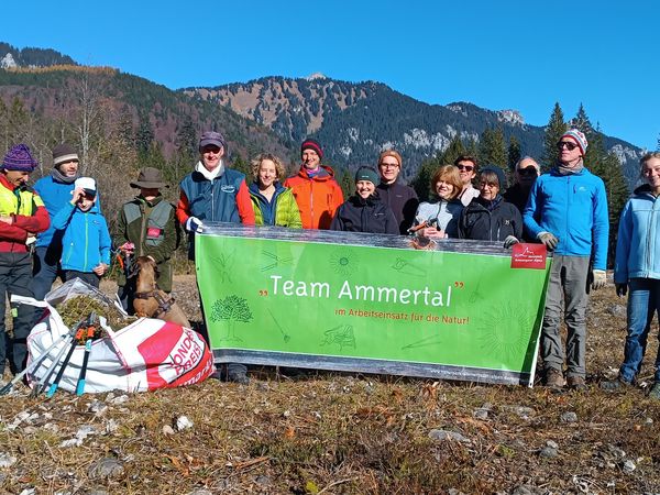 Fotos: die Einsatzfläche vorher, kleine Fichten, gefleckte Schnarrschrecke, Teamarbeit, Brotzeit, Team Ammertal