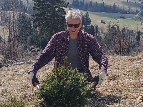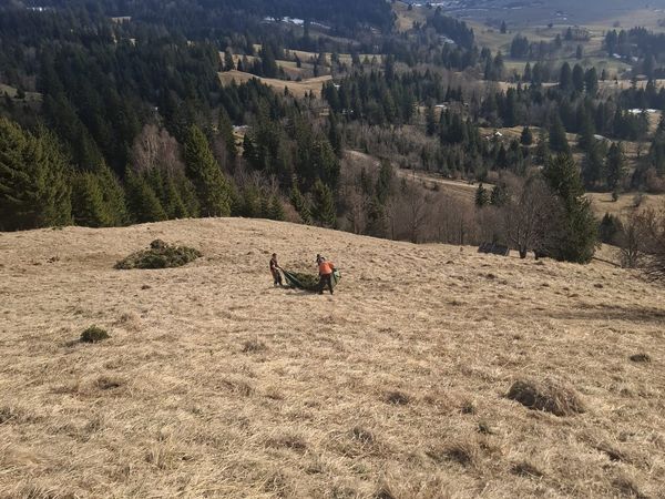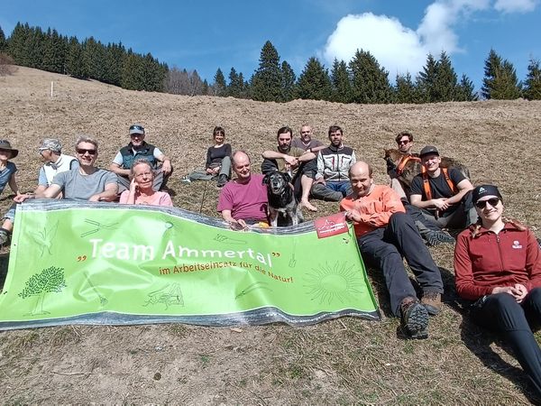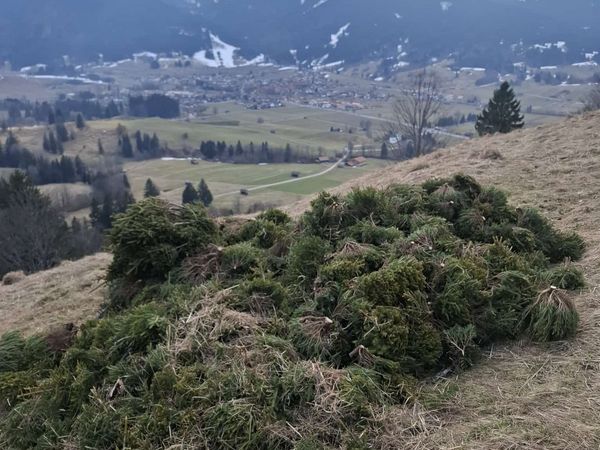 Am Einsatztag hatten wir frühlingshafte Temperaturen und ca. 20 freiwillige Helfer, die Erlen und kleine Fichten schwendeten, Heu rechten und aufschichteten.