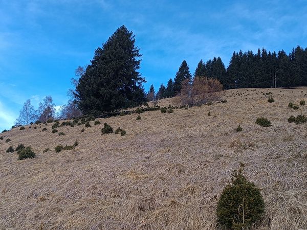 Ziel? Schaffung von Licht & Platz für seltene Tier- und Pflanzenarten des artenreichen Grünlands. Die Arbeiten finden an einem steilen Hang statt.
