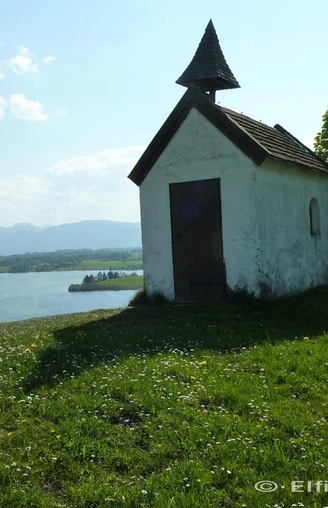 Wir gehen geradeaus an den Seestuben vorbei, kommen kurz darauf an eine Gabelung und biegen links in den Fußweg ein. Schon nach kurzer Zeit wird der Weg schmäler und führt zwischen Weideland und Wald ganz in der Nähe des Riegseeufers entlang. Schon bald treten wir wieder in die freie Landschaft hinaus und folgen immer weiter diesem Wanderpfad am Ufer entlang. Wir passieren mehrere private Grundstücke, bevor wir einen kleinen öffentlichen Badeplatz erreichen. Hier endet der Pfad, wir biegen nun rechts auf einen Feldweg ab. Wo er auf das nächste Sträßchen trifft, gehen wir links und dann geradeaus weiter bis wir auf eine Teerstraße treffen. Schon von weitem sehen wir die Mesnerhauskapelle auf dem Hügel.