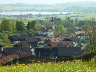 Eine Tafel berichtet vom Tränenwunder Anfang des 19. Jahrhunderts, das diesen Aussichtspunkt zur Wallfahrtsstätte werden ließ. Die „Vier Linden“ waren u. a. auch Motivplatz für die alte Hinterglasmalerei und frühe Photographie. Wassily Kandinsky schuf hier 1908 die „Landschaft mit Turm“. Wir gehen die Straße weiter, auf der wir gekommen sind. Sie mündet geradeaus in einen Fußweg, der bergab unter einigen mächtigen alten Blutbuchen hindurch führt. Wir überqueren eine Straße und folgen nun dem Fußweg auf der anderen Seite in Richtung Hagen/Guglhör. Direkt nach einem einzeln stehenden Haus auf der linken Seite führt links eine Forststraße Richtung Froschhauser See/Riegsee, der wir immer geradeaus folgen, bis wir nach Froschhausen gelangen. Wir halten uns rechts und erreichen nach wenigen Metern die kleine Kirche „St. Leonhard“, die so eng mit der Tradition der Froschhauser Leonhardifahrt verbunden ist. Das ehemals gotische Wallfahrtskirchlein wurde 1631 barockisiert, das genaue Alter ist jedoch unbekannt. In der Nähe des Eingangs erwartet uns eine Stele. Der Schlüssel für die Kirche kann im Hof Riegseer Straße 15 ausgeliehen werden.