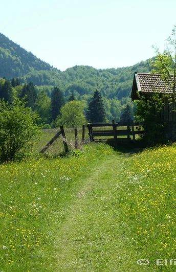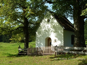Bevor wir heute weiterwandern, statten wir der Ohlstadter Mariengrotte einen Besuch ab. Sie liegt versteckt hinter der Kirche St. Laurentius. Um sie zu finden, gehen wir durch den Friedhof um die Kirche herum und finden im östlichen Winkel einen Durchgang in der Mauer. Über zwei Steintreppen können wir durch die kleine Anlage um die Grotte herum gehen. Laut Chronik ist im handgeschriebenen Merkbuch von Pfarrer Schlintmann zu lesen, dass sie „von März bis Sept. 1910 durch freiwillige Gaben“ erbaut wurde. Nach wie vor wird sie von den Einheimischen als Ort des stillen Gebets und der Fürbitte aufgesucht. Ein guter Platz, den Tag und eine neue Etappe des Weges zu beginnen. Auch die Dorfkirche lädt zu einem Besuch ein. Bereits im Jahre 1085 wurde sie erstmals erwähnt, 1702 brannte die damalige Kirche ab, 1762 fand die Weihe der jetzigen Kirche statt. Sechzig Jahre lang musste das kleine „Fieberkircherl“ als Ersatz für die Dorfkirche dienen. Zurück auf der Hauptstraße folgen wir ihr nach links, gehen rechts am Maibaum vorbei in die Heimgartenstraße, folgen ihr und gehen dann geradeaus weiter auf der Wankstraße. Es geht leicht bergauf, vor einer Brücke gabelt sich die Straße, wir halten uns links und kommen auf den „Rundweg Kaltwasserfälle“. Nach dem Gatter folgen wir dem kleinen Fußweg bergauf. Bei der Abzweigung „Ramm“ gehen wir rechts weiter und haben kurz darauf einen herrlichen Ausblick auf Ohlstadt, aufs Murnauer Moos und die gesamte umgebende Landschaft. Hier war früher der Startplatz für die Natureisbahn der berühmten Ohlstadter Bobfahrer, im Winter ist hier ein kleiner Skilift in Betrieb. Wir folgen dem Weg entlang der Anhöhe, vorbei am Kriegerdenkmal und gelangen geradeaus zum Ohlstadter Sportplatz. Wir kommen auf eine Forststraße und folgen dem Schild „Eschenlohe über Heuberg 5,8 km“. Nach etwa 200 Metern gelangen wir durch ein Gatter auf eine Viehweide. Wir folgen der Forststraße bis rechts ein kleiner Fußweg mit dem Wegweiser „Boschet-Rundweg“ auftaucht. Während wir diesem Pfad ein Stück durch die „Buckelwiesen“ und ein kleines Wäldchen folgen, sehen wir die „Boschetkapelle“ mit fünf Bildstöcken bereits auftauchen. Sie wurde aus Dankbarkeit erbaut, weil die Schweden im Dreißigjährigen Krieg (1618–48) Dorf und Einwohner verschont hatten. 1874 wütete der Milzbrand unter den Tieren, die Bauern legten in der Kapelle das Gelöbnis eines jährlichen Bittgangs ab und die Seuche erlosch. Eine Stele und eine Bank laden zum Verweilen ein. Wenn wir durch das kleine Fenster in der Tür schauen, entdecken wir rechts neben dem Altar eine „Schwarze Madonna“ mit Kind.