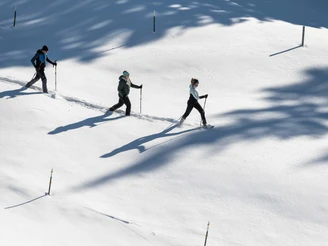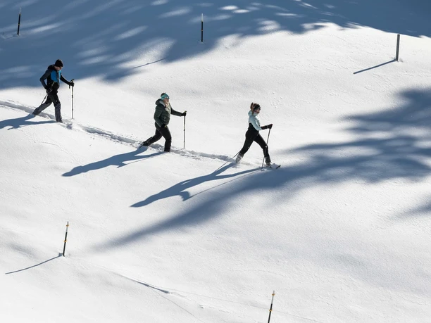 Der Abstieg führt entlang der Aufstiegsspur des Skitourenlehrpfades (ausgeschildert) hinab ins Tal. Bitte achten Sie, dass Sie immer neben der Aufstiegsspur für die Skitourengeher absteigen, um die Spuranlage nicht zu zerstören.