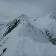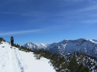Die Spur führt weiter Richtung Jägerhütte und dem Sommerweg folgend zum Ochsenängerle und einer kleinen Hütte. Unterhalb des Ost-Westrücken der Hochblasse werden die Hänge jetzt steiler und Sie steigen weiter bergan auf dem mit Latschen bewachsenen, breiten Westrücken.